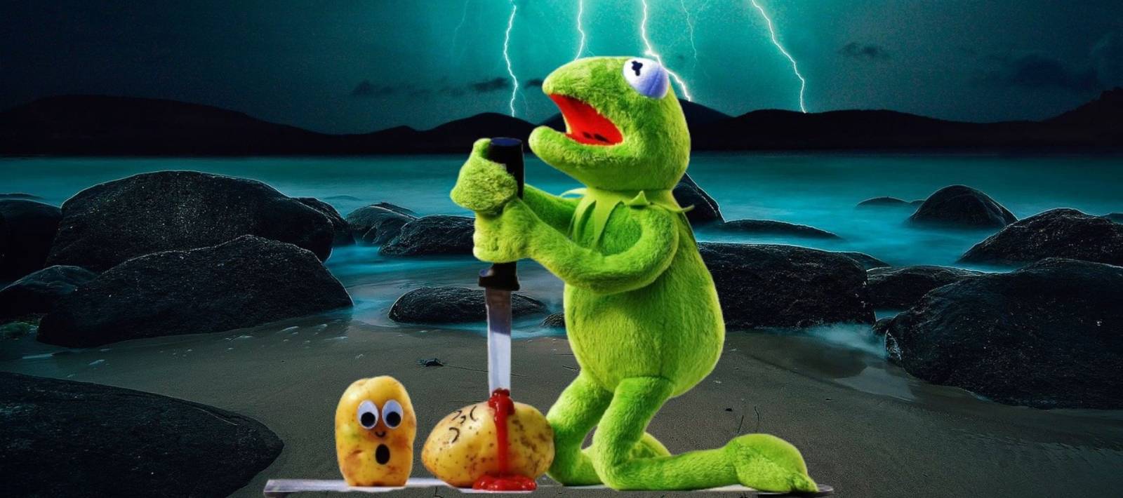 ¿Alguien sería capaz de imaginar a la RANA GUSTAVO, cual serial-killer, asesinando cruelmente a una patata, en mitad de una playa desierta y rodeados de rayos y centellas?
