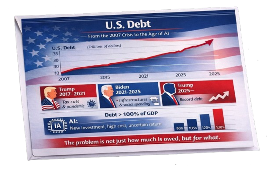 Upon his return in 2025, Trump used a discourse of apparent accountability and controlled spending, but in practice the debt has once again reached stratospheric levels. 37 trillion dollars, an all-time high.